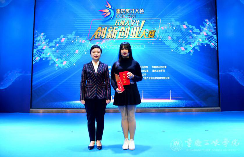 比赛现场,进入决赛的十个团队分别带来了精彩的展演项目,演绎了他们的创新创业历程,并高水平完成现场答辩环节。评委老师针对项目中存在的优缺点进行点评,根据选手的讲演提出针对性的建议和意见。经过激烈的角逐,来自我校的《三峡库区文创设计与情景体验》项目勇夺桂冠。部分优秀创业项目团队还现场签约入驻万州区大学生就业创业公共服务中心。
